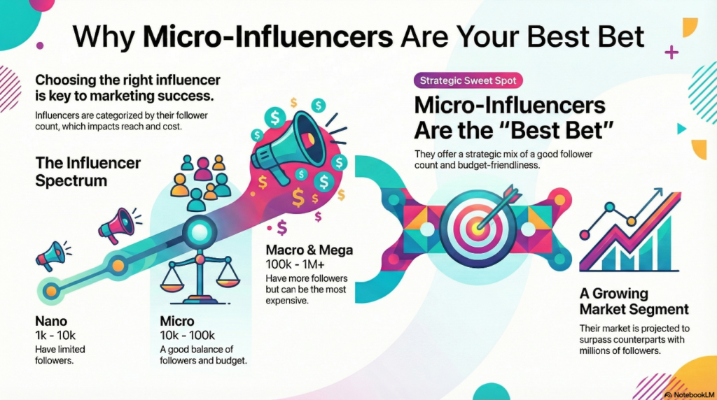 The world of influencers is categorised into Nano (1k to 10k followers), Micro (10k-100k), Macro (100k-1 Million), and Mega or Celebrity (over 1 Million). Working with them can benefit your marketing. But choosing the right one is the key. While Macro and Mega influencers have more followers, they can be the most expensive. Nano may work, but they have limited followers. The best bet would be Micro influencers who have a good number of followers and may fit your budget.